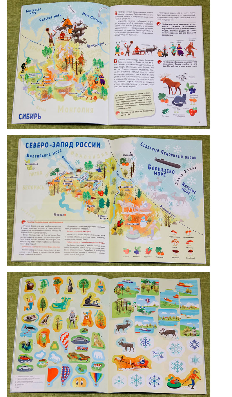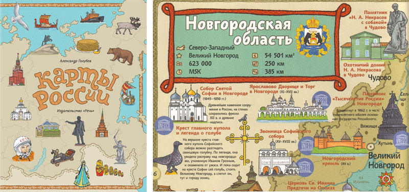 Еще один пример «распределенной России», в которой Москва – лишь одна из точек на карте (да, важная и значимая, но вовсе не «начало земли»), ‒книга Александра Голубева «Карты России» («Как нарисовать Россию»). Этот грандиозный рисованный атлас всех российских регионов строится по строго формальному и оттого объективному признаку – федеральным округам. Открывается он картой Архангельской области. К «Картам России» выпущены разнообразные активити: рабочая тетрадь, «раскраска-рисовалка-бродилка-находилка» и альбом с наклейками.