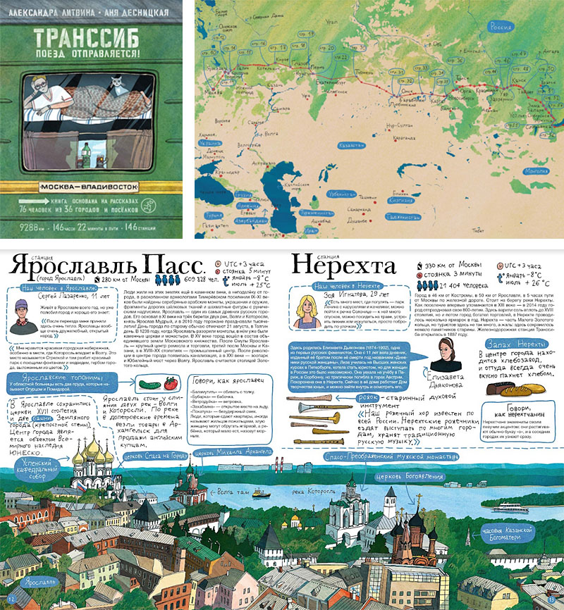 Нестандартный подход к географии России мы встречаем в книге Александры Литвиной и Ани Десницкой «Транссиб. Поезд отправляется!». Здесь Москва – лишь отправная точка для путешествия по самой длинной железной дороге в мире. В книге есть множество провинциальных городов и железнодорожных станций, подробности поездного быта и, конечно, виды России из окна поезда.