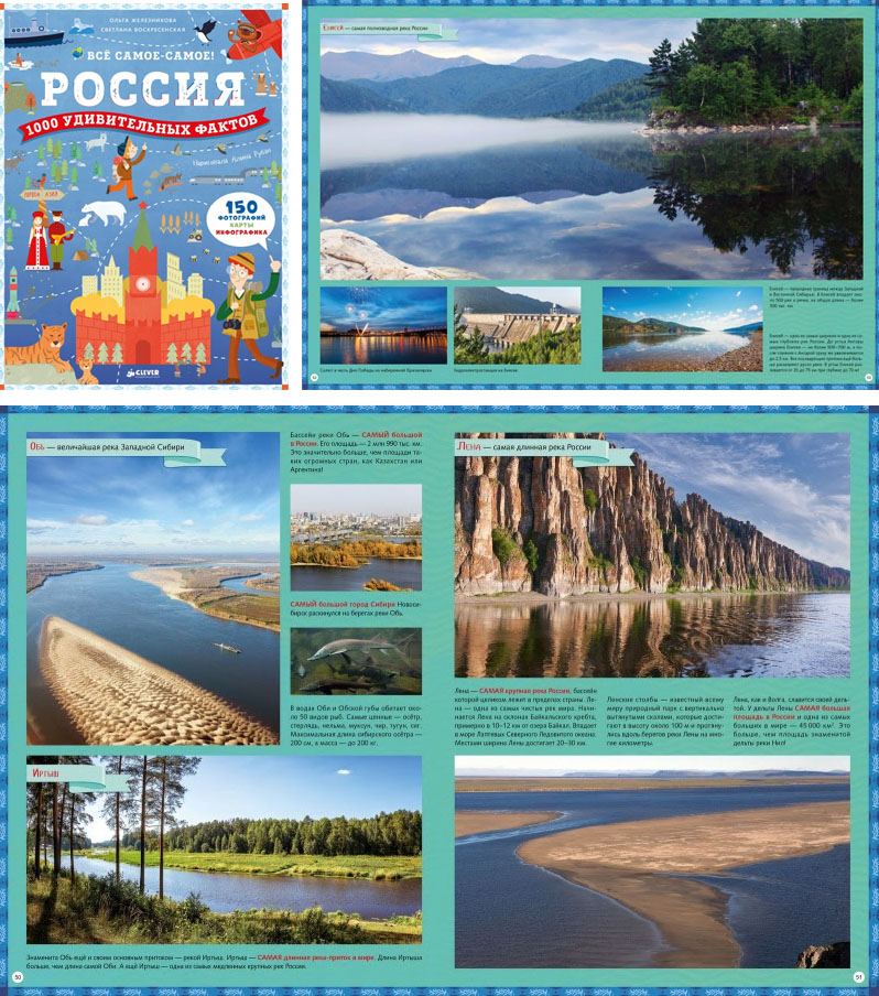 Еще одно исключение из правила ««не говорить про сегодня» связано с книгами о природе страны. Например, «Россия. 1000 удивительных фактов». Здесь подробно рассказывается про ландшафты, равнины, горы, озёра, вулканы, и часто можно встретить и современные фотографии, и сегодняшние события.