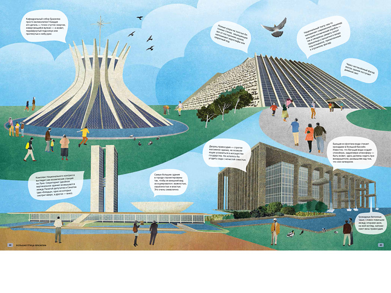 «Мы очень любим ваши прекрасные здания! Иначе зачем нам подвергать себя опасности и слетаться к ним целыми стаями?», ‒ начинает Крап свой рассказ и показывает список выбранных им архитектурных памятников (на голубином и человеческом языке). Это выглядит так: Клювы голодных птенцов, или Оперный театр в Сиднее; Серебряная загогулина, или Концертный зал Уолта Диснея в Лос-Анджелесе; Лес снов, или Храм Саграда Фамилиа в Барселоне.
