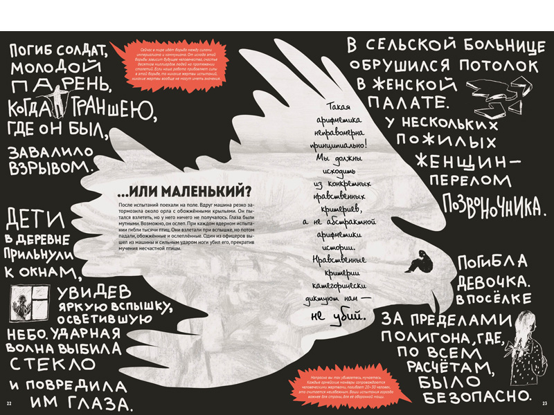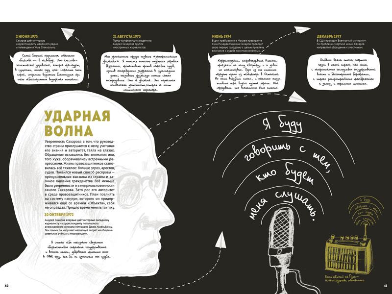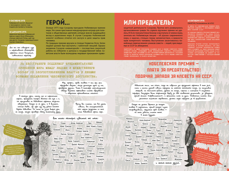 – Я думаю, нашу книгу можно читать и как роман, и как сборник эссе, потому что каждый страничный разворот мы создавали как законченную историю. Конечно, для того, чтобы понять контекст, неплохо бы знать, что было с Сахаровым до этого рассказа и после, там есть переклички между главами. Но вполне можно каждую из этих историй воспринимать как законченную – и с точки зрения текста, и с точки зрения картинки.