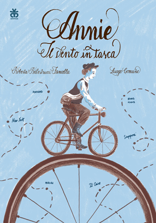 It was one of those books you pick out for yourself only to have it become one of your kid’s favorites. The graphic novel Annie: The Wind in Her Hair [Annie. Il vento in tasca. Written by Roberta Balestrucci Fancellu, illustrated by Luogo Comune. sinnos, 2019. ISBN 978887609408. The book is yet to be published in English] is a wonderful book that was unexpectedly accessible for a small child. My daughter Anya loved it. At only four, she was truly impressed as we read about a woman who traveled around the world on her bicycle. Anya drew pictures of her and rode around proudly on her bike with training wheels. If only she knew what it really meant for a woman in 1894 to travel around the world by bike in just one year! I was completely taken with Annie the character and Annie, the book, based on the true story of Annie Cohen Kopchovsky (1870-1947).