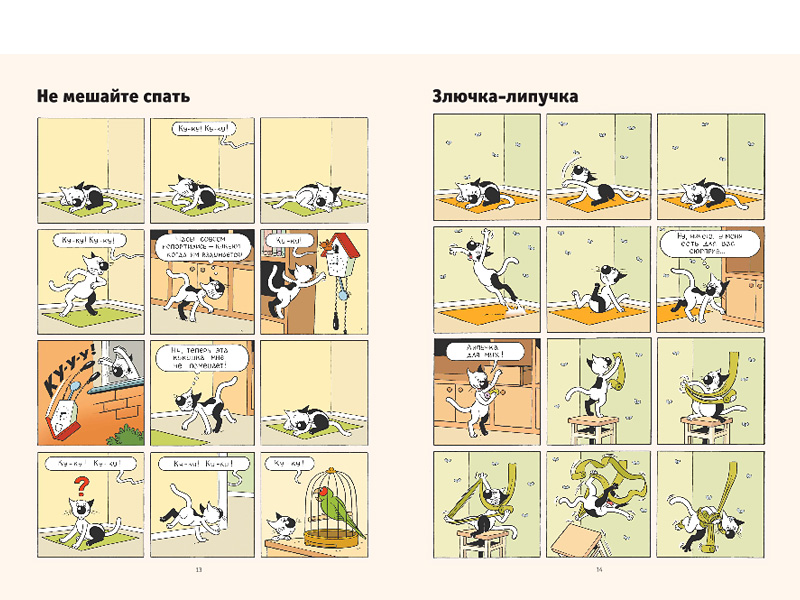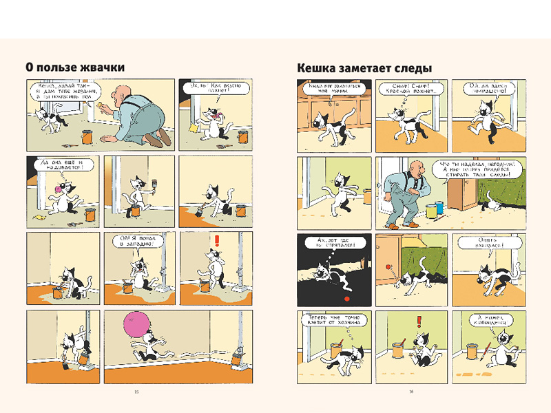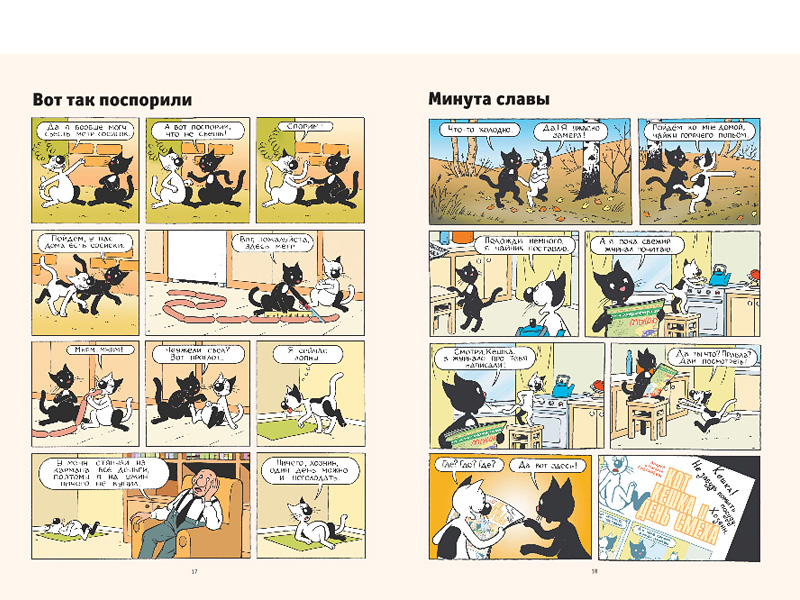 Отличная идея авторов ‒ рассказать эти маленькие истории именно в комиксе. Всего в книге 93 истории про говорящего кота – тут и бытовые ситуации, и фантастические рассказы. От помывки полов до полета на Луну и путешествия в прошлое. И самое удивительное, что все это захватывает людей всех возрастов, у нас даже мама с папой истории про Кешку читают с удовольствием.