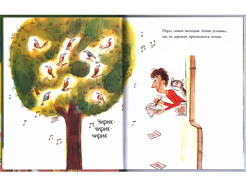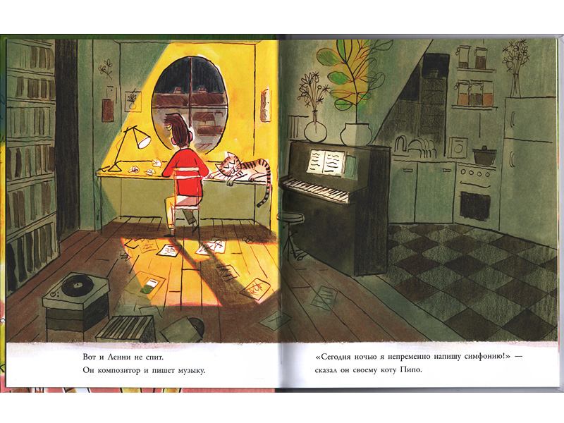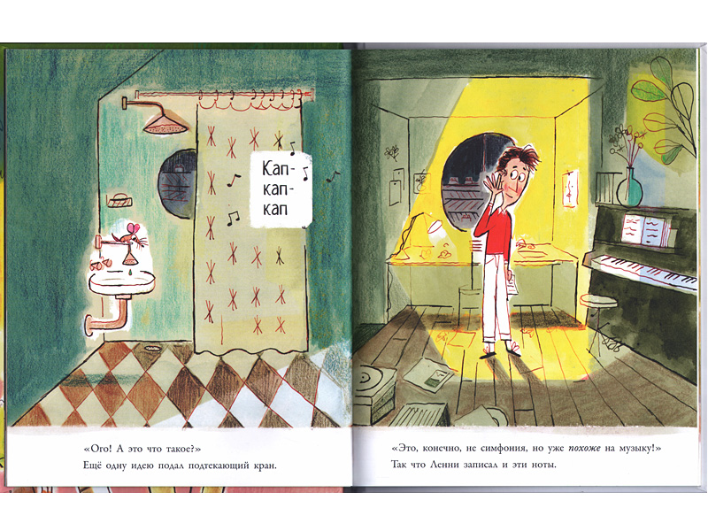 Недавно у нас дома появилась новая книга ‒ «Мелодия жизни» Луи Тома. Композитор Ленни не спал всю ночь, чтобы написать новую симфонию. Но что-то у него не ладилось — ни единой ноты не появилось на листочке бумаге, пока его кот Пипо не подал идею, начав лакать воду из миски. Вот тогда Ленни и обратил внимание на то, что вокруг полным-полно самых разнообразных звуков.