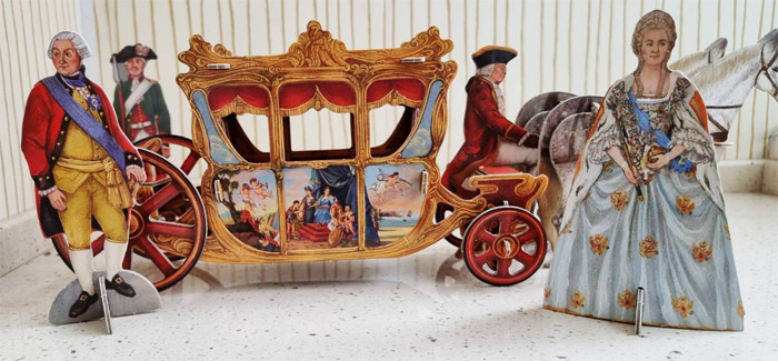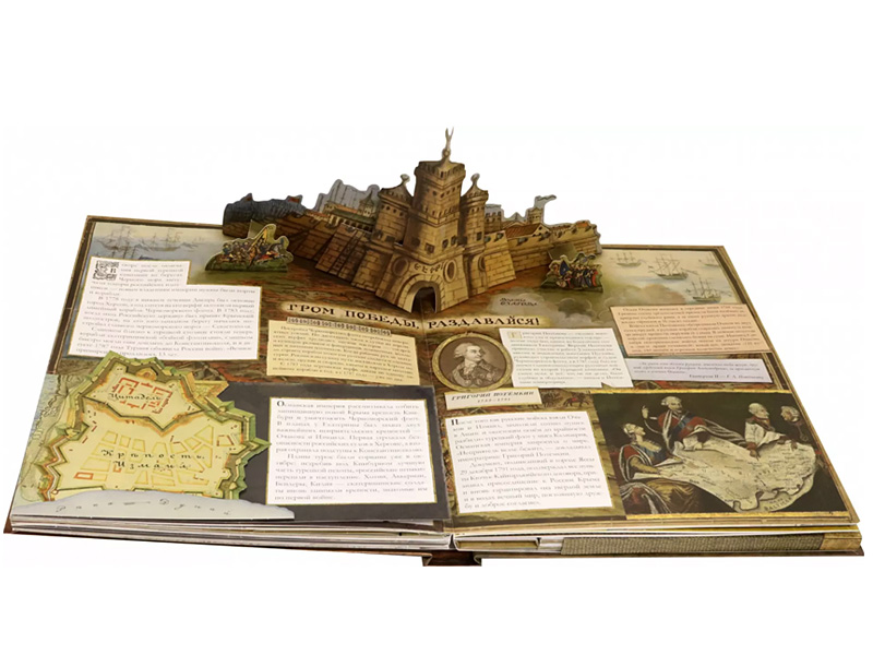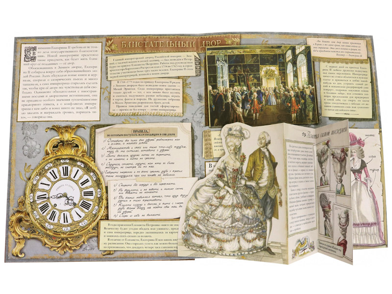 Да и внутри книга похожа на музейное собрание, связанное с эпохой Екатерины Великой. Историки, писатели, скульпторы, критики, ученые, политики, чеканщики монет 19 века и даже сама Екатерина II в этой книге делятся своими реальными, зафиксированными в старинных источниках мыслями. Современные издатели очень умело соединили в этой «неклассической» книге самые разные материалы и технологии. Она даже кажется немного «механизированной» ‒ складывается, раскладывается, включает в себя панорамы и объемные картины. Я с детства занимаюсь складыванием оригами, поэтому мне нравятся такие «живые» и подвижные книги. Их и читать интереснее, увлекательнее и веселее. В этой книге есть даже красивая сборная модель кареты с главными героями.