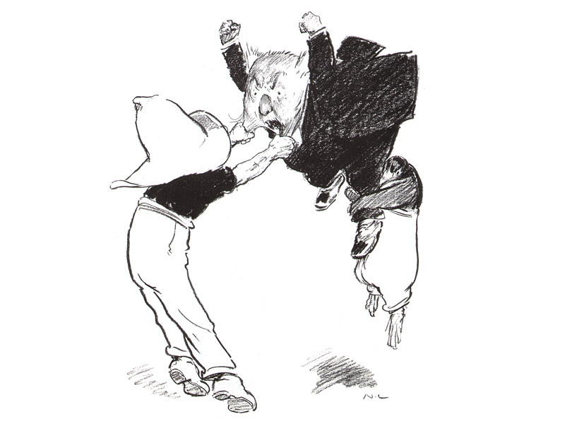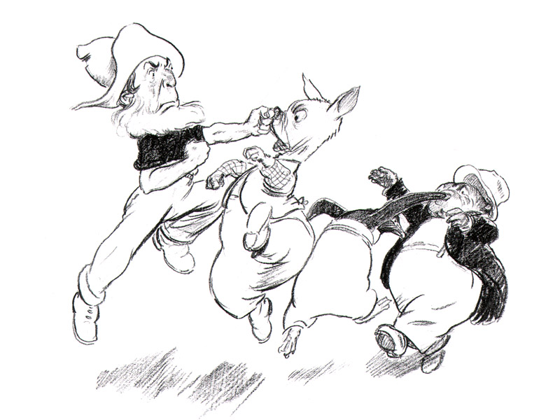 И да, через каждые три страницы герои действительно затевают потасовку. Но она совершенно бескровна (тут даже клюквенным соком не пахнет). А если чем-то мерить жестокости, допущенные автором в повествование, то они сродни невзгодам персонажей английских лимериков – в их мягком варианте. О лимериках Эдварда Лира нельзя не вспомнить, рассматривая рисунки Линдси: персонажи кувыркаются, тянут друг друга за носы, подпрыгивают, жестикулируют, застывают в безумных позах, означающих «размышление». И вообще довольно легко представить себе, как иллюстрации вдруг «оживают» и превращаются в динамичное анимационное кино…
