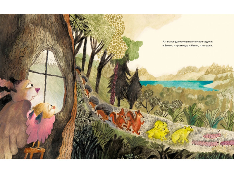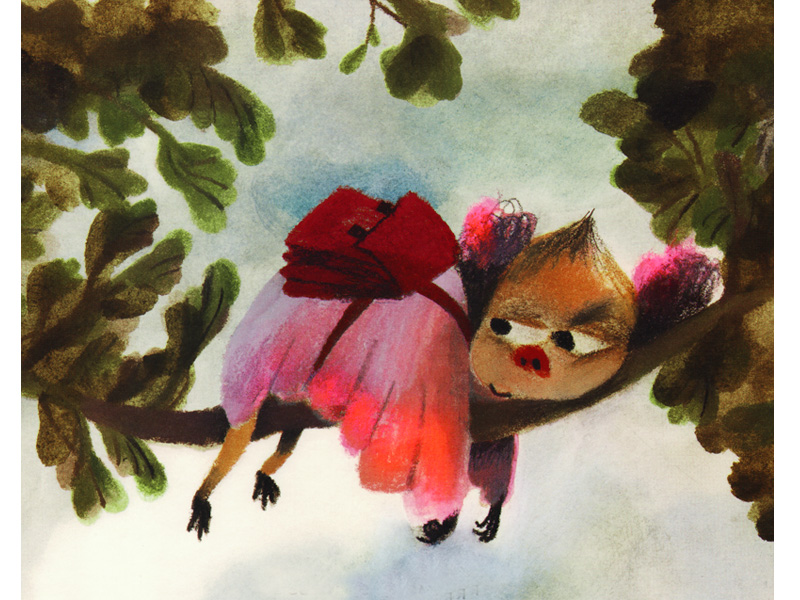 Но наши ожидания не оправдываются. Происходит нечто странное: от вопля Паскалины ее родители… скукожились! Он стали совсем крошечными, как два орешка. Девочка, между тем, совсем не испугалась. Напротив, очень довольная Паскалина спрятала родителей под крылышками и решительно направилась в детский сад.
