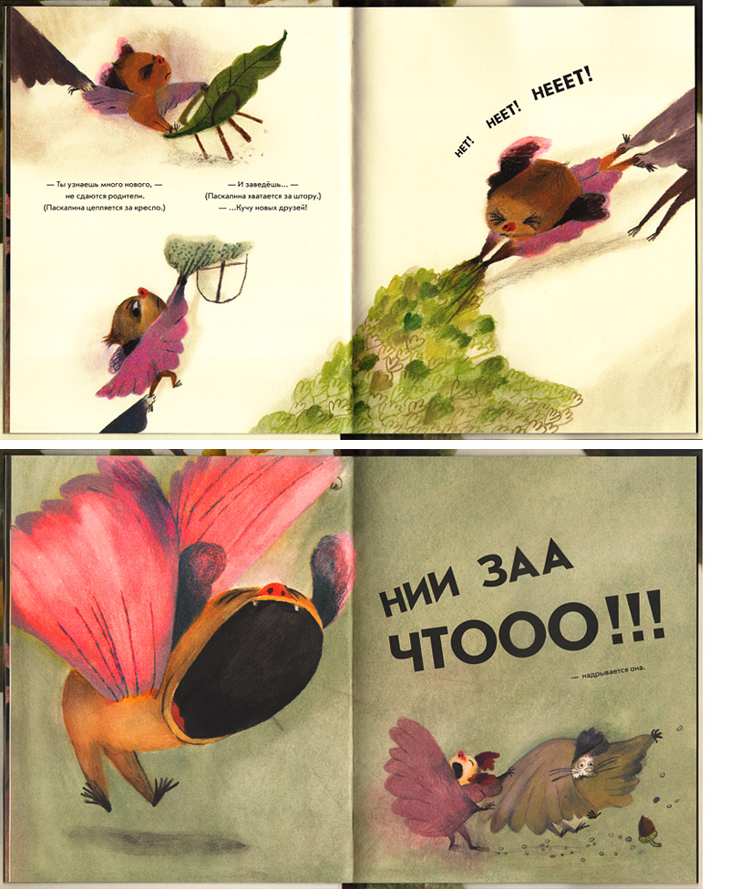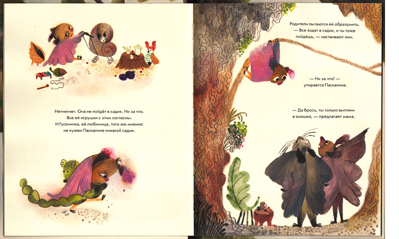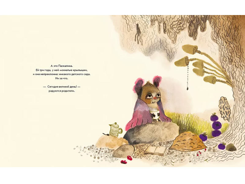 Вот тут и начинаются странности. Вместо привычных мишек и зайчиков, хомячков и лисят главным героем становится летучая мышь – очень редкий персонаж детской литературы. Мышке Паскалине три года, и единственное, что, помимо возраста, нам сообщает о ней автор, ‒ что у нее мохнатые крылышки. На иллюстрациях мы видим очень милую девочку с розовыми крылышками и ушками. А еще мы замечаем, что Паскалина весьма упряма и умеет настоять на своём. Она ни за что не пойдет в детский сад!