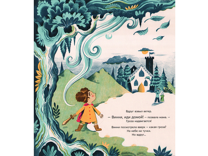 Винни вдохновляется и легендой, и образом дракона с гобелена. Она не выпускает из рук свой деревянный меч и, сражаясь с одуванчиками и лютиками, представляет себя отважным воином, который ничуть не боится чудищ. И конечно, вскоре она попадает в волшебный лес, где живут и дракон, и древочеловек, и лев, и грифон ‒ все, кого она видела дома на гобелене!