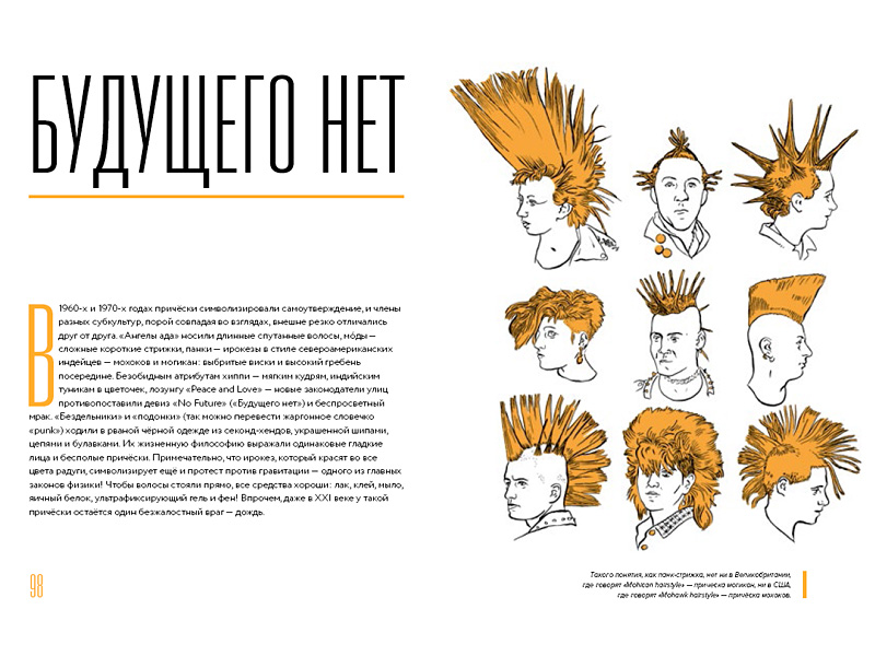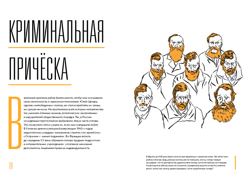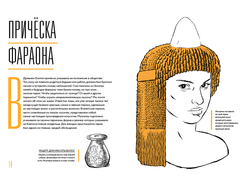 Сейчас довольно редко можно встретить людей, которые носят парики, а во времена французского короля Людовика XIV все дворяне специально брили голову и носили парики. В наше время некоторые люди перекрашивают волосы в рыжий цвет, а в Средние века рыжий цвет волос считали проклятым. Сейчас мужчины и женщины иногда выбривают себе левую или правую часть головы, а в царской России заключённым специально выбривали левую часть головы ‒ это позволяло легко опознать сбежавших преступников. До прочтения книги «Волосы. Почему их цвет длина и форма всегда имеют значение» я знала совсем немного про историю разных причёсок. Особенно мне понравились изображения причёсок в стиле панк-стрижка, причёсок богов и образцы париков.
