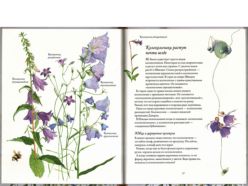 А в траве происходит такая же мудрая смена жизни. Мы замечаем, что шары одуванчиков седеют, и расцветает новый слой: желтые, словно покрытые лаком, лепестки лютиков, мелкие соцветия тысячелистника, душистый клевер. Когда в лесу ярус за ярусом распускаются травы, всё звенит, поет и голосит – самое время перечитать страницы из книги, посвященные растениям. Как много новых названий и интересных историй! Мне очень нравится история колокольчиков. Раньше люди называли их юбками нимф, развешенными на просушку. А еще из них делали чернила. Сережа любит цветы с медовым ароматом ‒ оказывается, это подмаренник настоящий. По легенде, Дева Мария положила эти цветы в ясли младенцу Христу.