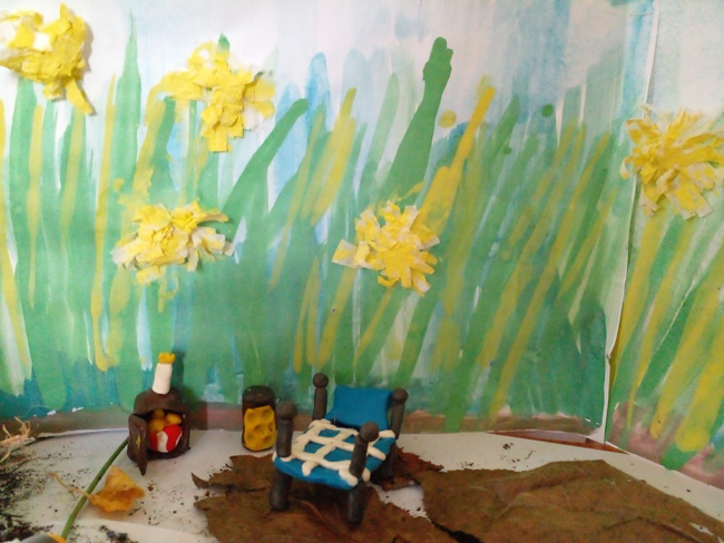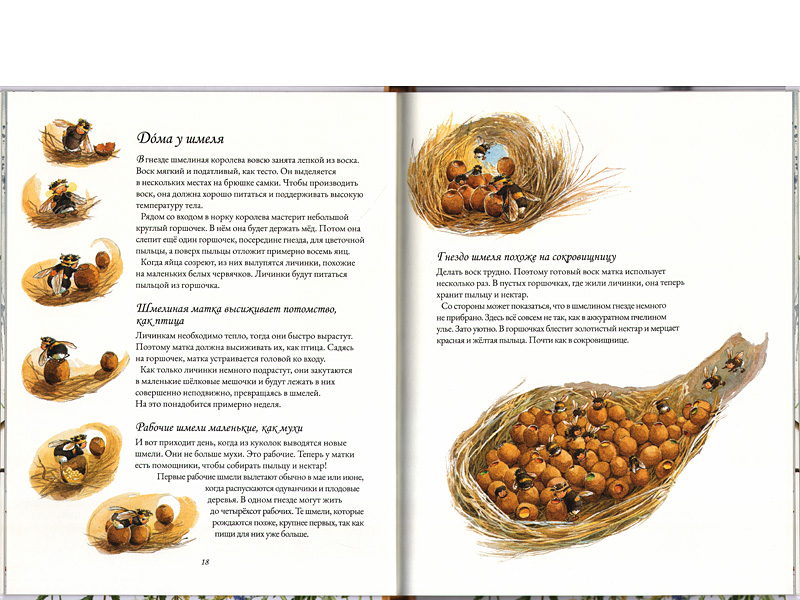 А сейчас мы и сами похожи на шмелей, потому что, читая эту книгу, так увлеклись, что захотели придумать пластилиновую научную историю. Сережа лепит шмеля-королеву. Старшая сестра помогает ему делать рабочих шмелей. Из ваты мы сооружаем зимнюю декорацию, а летний луг рисуем гуашью. По книжке придумываем сценарий. Время идет, и уже распускаются одуванчики и первые полевые цветы. Теперь Сережа знает их названия. Всё берем в свою историю: камни, старые осенние листья, траву, цветы. В последний момент Сережа придумывает кроватку, настенные часы и тумбочку для хранения пыльцы и меда. Вся семья участвует в создании нашего первого научного мультфильма. Добавляем музыку – теперь уже точно цветочная история шмеля стала нашей общей историей.