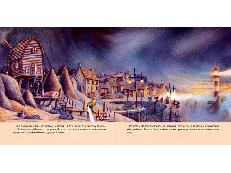 Эти истории в пересказе могут показаться слишком простыми и наивными, с «обязательным» хеппи-эндом (тексты для дошкольников не должны заканчиваться плохо). Но в книгах эти истории, наполненные чарующими деталями, производят совершенно другое впечатление: тихая и обаятельная гармония мира рыбачьей деревушки (и детского мира Молли) все время подвергается каким-то испытаниям, но все-таки выдерживает, сохраняет свою стабильность. Этот мир излучает какое-то волшебное сияние, от его созерцания просто невозможно оторваться – и происходит это в том числе благодаря удивительным иллюстрациям Эндрю Уитсона. В меру мультяшные (в стиле 3D), иногда подчеркнуто асимметричные и «неглянцевые» изображения, чаще в пастельных тонах, с самого начала приковывают к себе взгляд. Герои кажутся удивительно живыми, а неожиданные ракурсы и непривычные пропорции в пейзажах вызывают удивительный эффект: ты словно «проваливаешься» в мир рыбачьей деревушки.