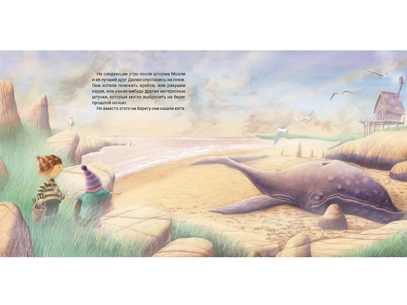 …Однажды утром Молли с другом обнаружили на берегу кита, который не мог уплыть в море. Все жители деревни целый день трудились над тем, чтобы кит не умер: поливали его холодной водой, подкопали под ним песок, чтобы он оказался в воде (пусть ее и недостаточно, чтобы уплыть, но хватит, чтобы он не погиб).