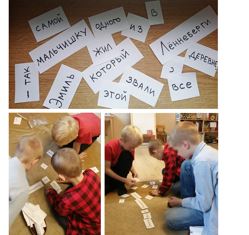 Можно было тянуть вопросы по очереди лично для себя, а можно было отвечать всем вместе. Так что первые десять минут игры прошли в веселой суматохе, и оробевшие было гости нырнули в игру с головой. Потом они немного поработали типографскими наборщиками. Перед ними был рассыпан текст начала первой главы, написанный крупными буквами на отдельных карточках, все слова перемешаны. Нужно было попытаться собрать предложения заново. Это, кстати, оказалось совсем не просто, но вместе ребята справились. Десятилетний Митя играл в типографии роль эксперта, задавал наводящие вопросы или дарил подсказки, если было совсем сложно.