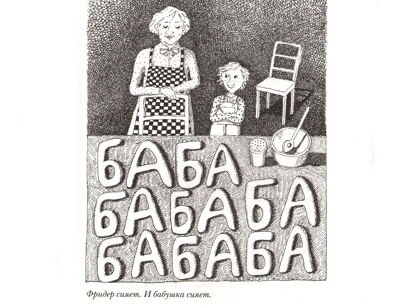 И еще была одна сложность – в главе, где Фридер с бабушкой пекут булочки. Фридер хочет научиться писать. И бабушка в качества образца, который ему нужно скопировать, пишет слово «ома» – по-немецки «бабушка». «Ома» и по-немецки и по-русски выглядит одинаково. Такое уникальное слово! Это забавно, а еще удобно с точки зрения иллюстраций, ничего не пришлось бы менять. Но можно ли оставить немецкое слово в тексте? А там еще была хитрость: когда у Фридера не получается слово написать, бабушка предлагает ему вылепить буквы из теста. Слово «ома» короткое, и там есть круглая буква «о» – то есть лепить очень легко.