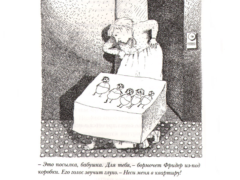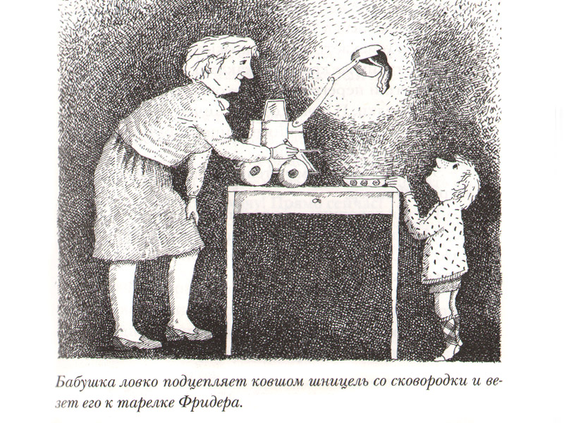 Она отвечает так: родители у Фридера есть, но мне были интересны только взаимоотношения бабушки и внука. Представьте, что папа и мама у Фридера в длительной командировке – ну хоть в России. Я очень обрадовалась, услышав ее ответ, именно так я и предполагала. Это как на театральной сцене, где прожектор направлен на двух персонажей. Они оказываются внутри светового круга, и к ним приковано внимание зрителей. Книги Мебс – не дневник жизни мальчика, не описание его быта день за днем. Это отдельные эпизоды жизни, эпизоды взаимодействия с бабушкой. Родителей нет в книге, потому что они не важны автору. Это писательский прием. Такой интересный прием. Ничего подобного я в немецкой литературе не встречала. Может, что-то такое и есть, в Германии выходит очень большое количество качественных детских книг. Но я не встречала.