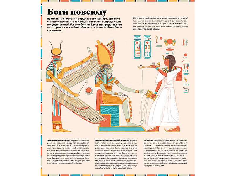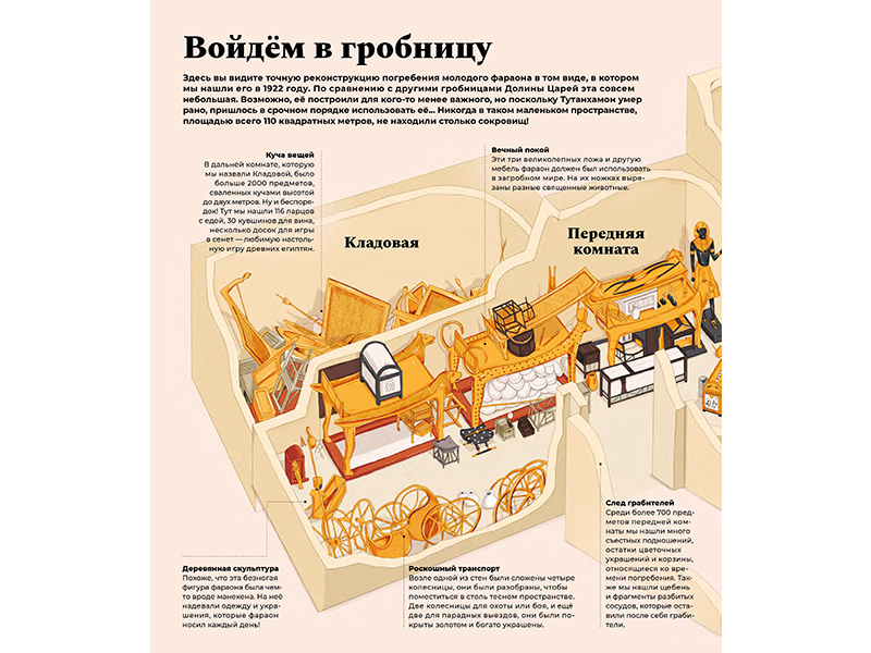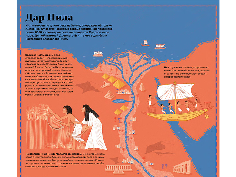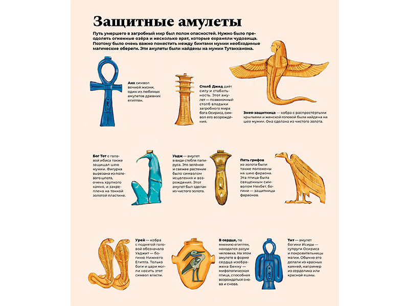 Поэтому книга была прочитана нами на одном дыхании. Фактов в ней действительно много, но все они представлены вполне доступно, с плавными переходами от простой, понятной темы к более сложной. Сведения о фараонах и социальном строе Древнего Египта, карты и мифология, амулеты и мумии ‒ кажется, что вместе с этой книгой путешествуешь во времени. (Меня удивило то, что мужчины носили макияж, и это было одним из символов власти.) Даже расхитителям гробниц уделено внимание!