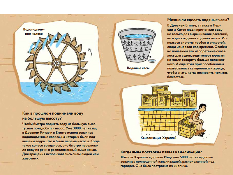 А в разделе «Что такое вода?» мне было интересно прочитать, что вода быстрее закипает в горах. Особенно меня заинтересовал раздел «Как люди использовали воду в прошлом». В нём рассказывается, что раньше делали водяные часы для судов, священников, жрецов. А воду поднимали с помощью «журавля» или архимедова винта, либо с помощью водоподъёмного колеса.