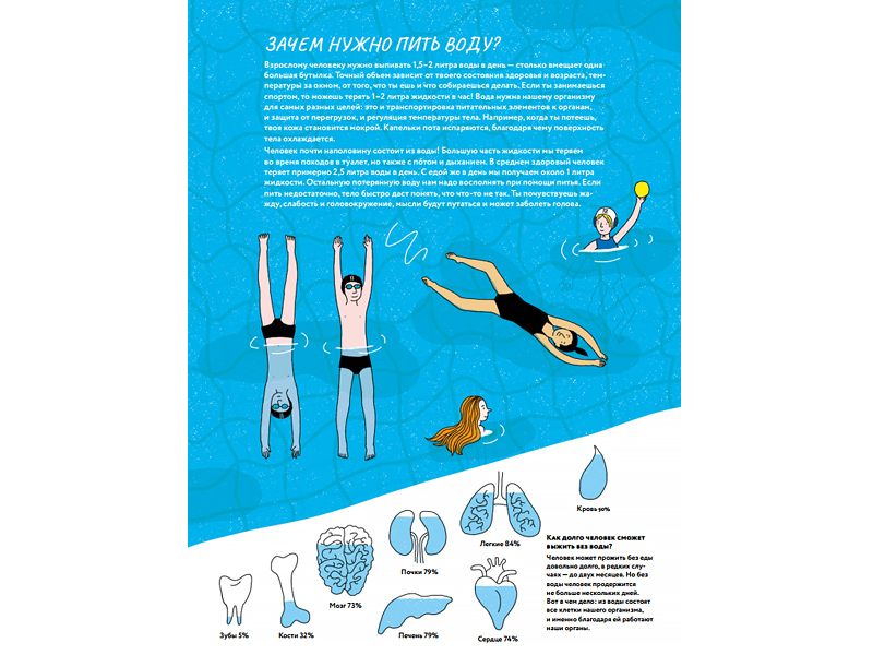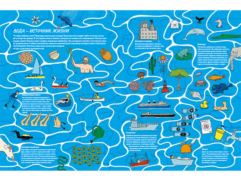 В книге можно найти полезные практические советы – например, как экономить воду; интересные факты – например, что наш мозг на 73% состоит из воды, лёгкие – на 84%, а зубы – только на 5%; познавательные рассказы о том, как возникают грунтовые воды и как их найти, надо ли беспокоиться из-за таяния ледников и загрязнении грунтовых вод, как устроены водохранилища и плотины.