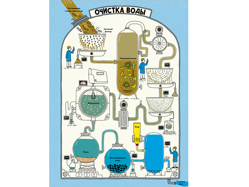 Книга «Большая книга воды» наполнена не только интересными фактами, но и рисунками и, что мне особенно понравилось, схемами. Например, схема очистки воды от загрязнений, схема полосатого буша (это такой особый вид леса), схема дождевых облаков, схема барьера для защиты от наводнений.