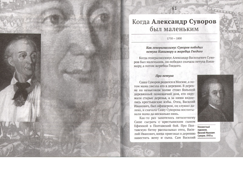 Конечно, этот прием и раньше использовался в детской литературе и изредка проникает даже в учебники, но часто эти «истории из детства» все равно выглядят неживыми. А Валерий Воскобойников сумел рассказать о великих людях так просто и ярко, что дети действительно рады таким товарищам-ровесникам. Повествование о каждом герое разбито на несколько коротких запоминающихся историй. Мы прекрасно знаем, что до определенного возраста дети мыслят образами, картинками и именно так легче воспринимают новую информацию, но почему-то редко пользуемся этим знанием в реальном учебном процессе. А рассказы Воскобойникова очень напоминают классические «story» – яркие, образные истории со счастливым концом, полные неожиданных приключений. Именно через такие истории входят в ребенка образы Большой истории – когда мы рассказываем, особенно не заботясь о хронологии, о том как выглядела школа, в которой учился дедушка, и как прекрасно было свадебное платье бабушки. Эпоха запечатлевается в сознании ребенка именно такими картинками. И Валерий Воскобойников пишет для детей именно так.