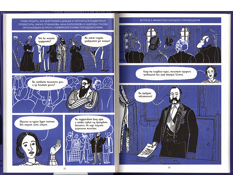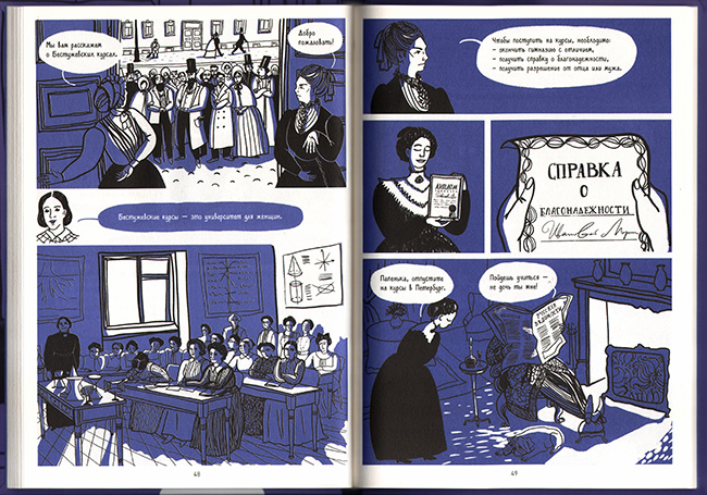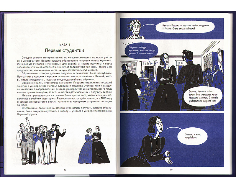 «Мама, ты тоже бестужевка?» – спрашивает меня Сережа, рассматривая картинки из книги Анны Русиновой, Дмитрия Гусева и Татьяны Цырлиной «Бестужевки. Первый женский университет». Для него это первое знакомство с жанром комикса. Реплики из фиолетовых облачков (книга удивительной бело-фиолетовой гаммы) легко читаются даже начинающими. Перед каждой историей в картинках, в начале главы, есть вступительный текст, который может прочитать взрослый, чтобы очередь ребенка пришлась на картинки. Так мы с Сережей и читаем.