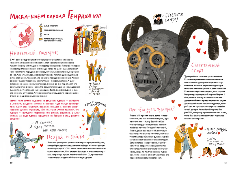 В обычной жизни маски могут использоваться в самых разных целях. Маски, например, надевают преступники, чтобы скрыть лицо. Существуют спортивные маски и маски для подводного плавания. Еще в книге рассказывается о западно-европейских бальных масках и связанных с ними традициях, о снеговых очках. В Арктике их обычно делали из моржовых клыков, китового уса, бисера и дерева. Я уже видела подобные маски на выставке, посвященной народам Арктики, но в книге прочитала новые для меня сведения. Особенно мне запомнилась маска-шлем короля Генриха VIII с удивительными рогами и очками без стёкол – она предназначалась для участия в рыцарских турнирах.