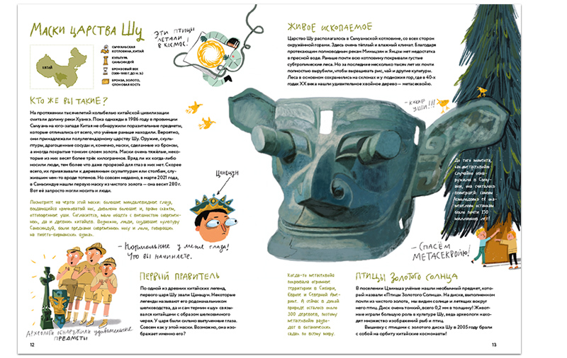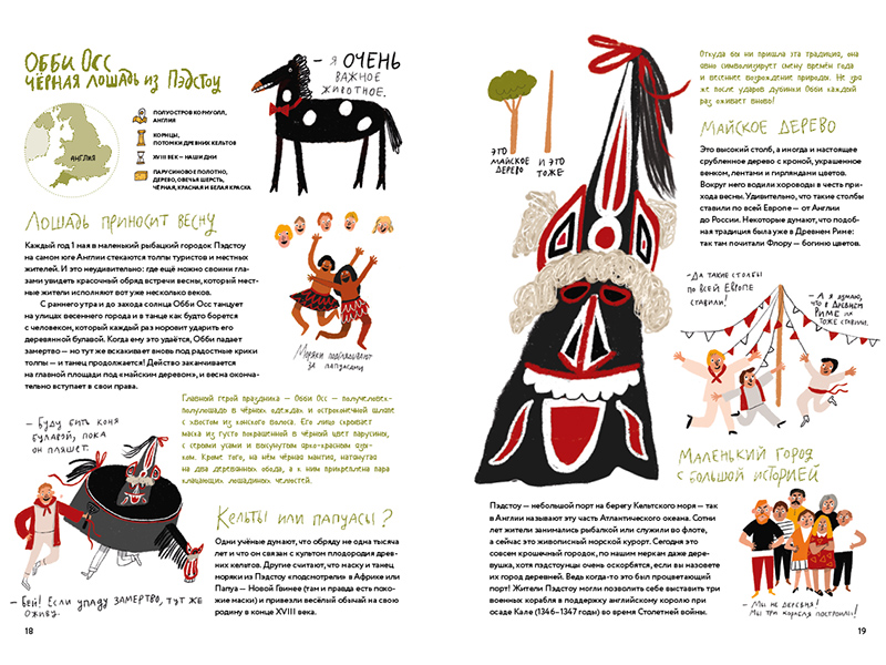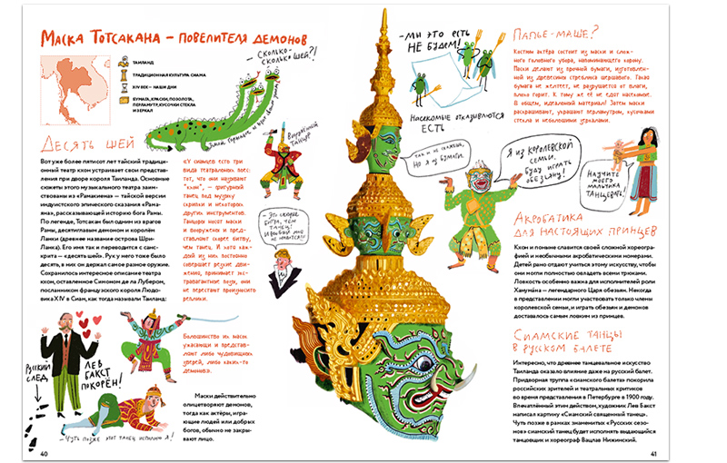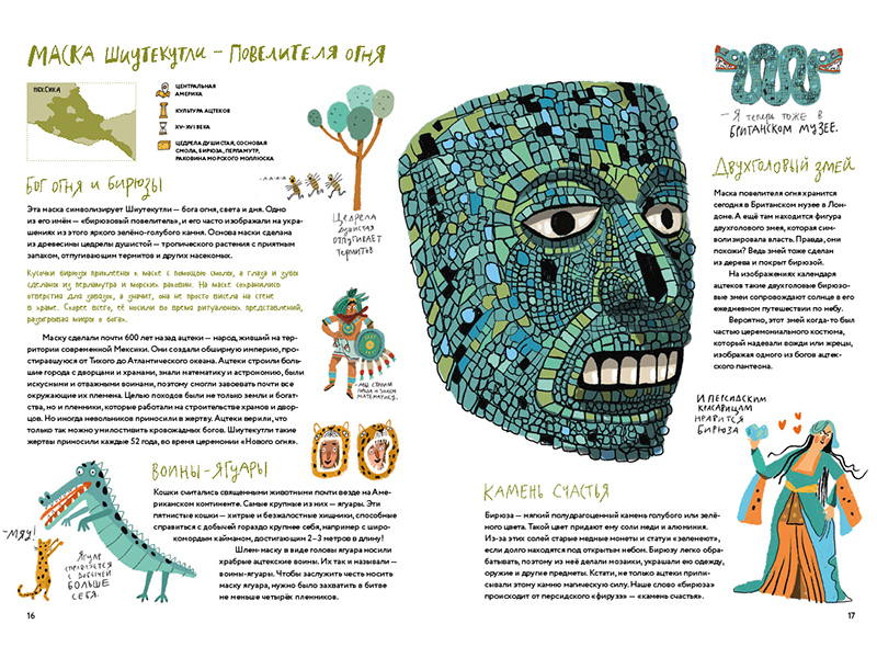 Мне понравилось, что рядом с каждой маской в книге есть интересные факты о ее создателях, месте бытования и материалах, из которых она изготовлена. А в конце можно найти полезную информацию о музеях мира, где можно увидеть маски. Например, в Санкт-Петербурге – в Кунсткамере, в Москве – в Государственном музее Востока, в Лондоне – в Британском музее. Музеи с масками есть и в Афинах, и в Париже, и в Вашингтоне. Жалко, что автор не рассказал про маски ряженых на празднике Масленица (они выставлены в Этнографическом музее в Санкт-Петербурге).