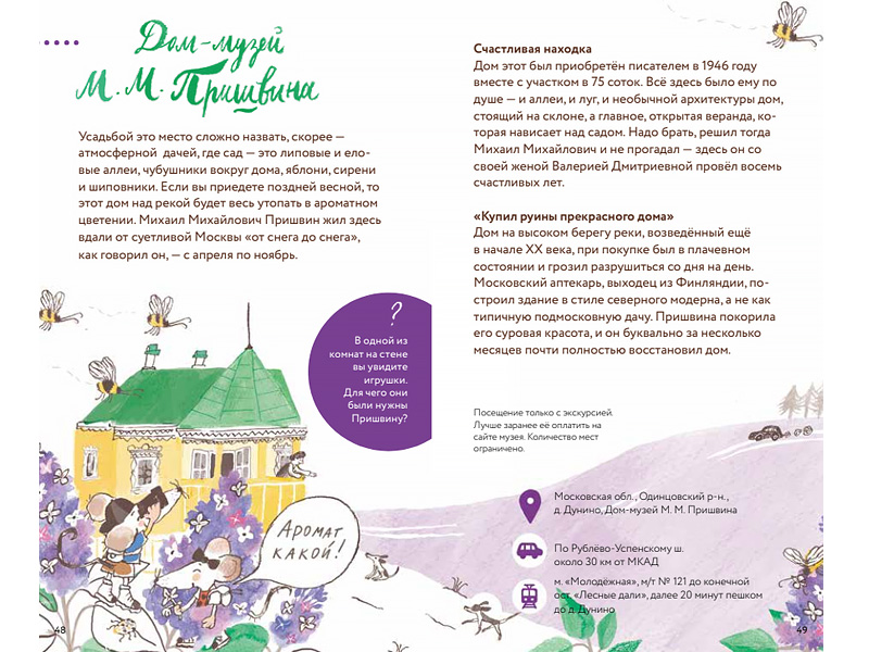 Вместе с этим путеводителем я уже побывала в двух усадьбах: Горках Ленинских и Дунино. Именно благодаря этой книге я узнала, например, что в усадьбе Горки существует настоящий подземный ход, а в Дунино я не только посетила дом-музей писателя, но и прогулялась по живописнейшей пришвинской тропе вдоль Москвы-реки.