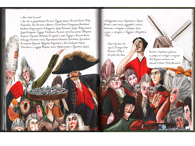 Иллюстрации в книге красочные, на них показаны жители города из разных сословий. Некоторые рисунки выглядят пугающе: неубранные землянисто-глинистые дороги, пышная и не всегда удобная одежда, неприветливые лица прохожих… А некоторые рисунки – одновременно и пугающие, и комичные. У некоторых жителей города, например, шеи чрезмерно короткие и толстые, а у других – слишком длинные. Но я понимаю, что так художник создает образ Санкт-Петербурга того времени.