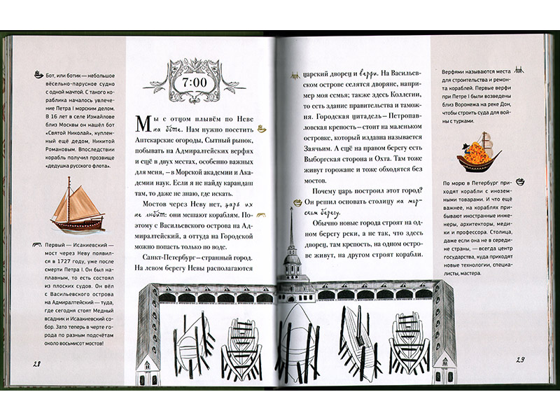 Почти на каждой странице есть сноски с объяснением старинных слов и историческими комментариями, так что можно не просто читать о жизни героя, а еще и узнавать что-то новое о 18-м веке и о Санкт-Петербурге. Например, почему Пётр Первый построил новую столицу на берегу моря (корабли могли быстрее доставлять туда иноземные товары и привозить иностранных инженеров, архитекторов, медиков). Или интересные сведения про сейчас такие обыденные, а в то время очень дорогие продукты, как сахар и соль.