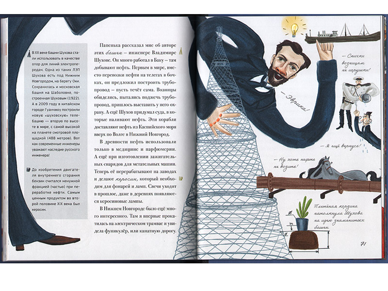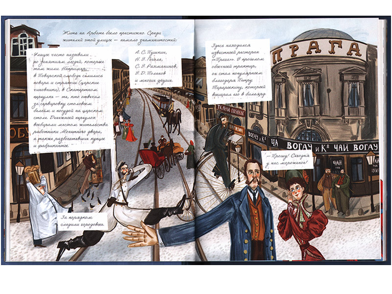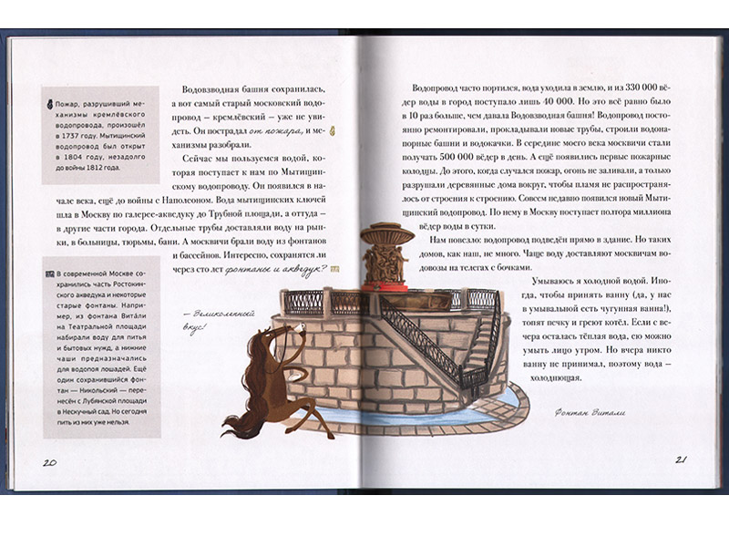 Например, о предназначении фонтанов: оказывается, они использовались не только для красоты, но и чтобы пить из них воду. О Московской Пятой гимназии – это старейшее в России учебное заведение, в котором учились многие известные люди. Или о том, как проверяли хлеб на свежесть: надо было ударить по нему ладонью, и у свежевыпеченного хлеба корочка должна была ненадолго вдавиться, а потом вернуться обратно. Необычно, что в те времена было принято называть родителей «мамаша» и «папаша»: сейчас это звучит насмешливо. Ещё рассказывается о башнях Шухова. И что Владимир Шухов не только спроектировал эти удивительного вида башни (они выглядят необычно даже в наше время), но и сделал первый нефтепровод.