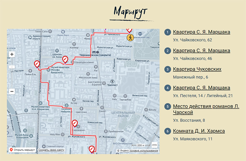 В проект есть несколько точек входа: «Личность», «Эпоха», «Тема», «Улицы». Отдельный маршрут посвящен детской литературе, ведь именно в Ленинграде, в окрестностях Литейного проспекта, рождалась и изменялась до неузнаваемости отечественная литература для детей. В реальности четырехкилометровый маршрут займет около часа, а в виртуальном исполнении – гораздо меньше.