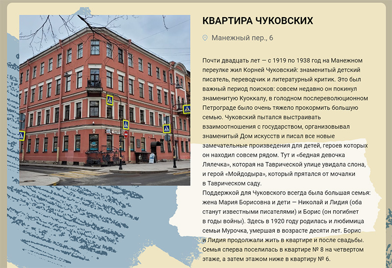 Музей Анны Ахматовой в Фонтанном доме создал виртуальную карту «Я тут был» (ятутбыл.рф). Все желающие из любой точки планеты имеют возможность пройти ленинградские маршруты семьи Чуковских, Даниила Хармса, Иосифа Бродского. Сайт отличается прекрасным дизайном, точной локализацией адреса на карте, содержательной справкой по каждому адресу, которая акцентирует связь места с творчеством писателя.