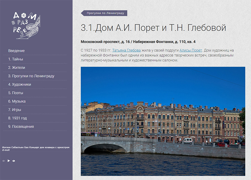 Близкий по духу, но сделанный почти на 10 лет раньше, виртуальный проект «Дом в разрезе» посвящен вроде бы далёкой от литературной географии теме. В 1931 году ленинградские художницы филоновской школы Татьяна Глебова и Алиса Порет создали картину «Дом в разрезе», которая сегодня хранится в Ярославском художественном музее. Сайт http://domvrazreze.ru/ представляет собой подробнейшее путешествие по этой картине, на которой изображен ленинградский дом на углу Фонтанки и Московского проспекта. Именно там с 1927 по 1933 год жили Глебова и Порет, там они создавали иллюстрации к детским книгам – многие из них переизданы сегодня. Туда же приходили Маршак, Чуковский, Хармс, Введенский, Олейников, Житков, художники и композиторы. Этот дом и его обитатели стали героями картины, а музей создал виртуальный путеводитель по Ленинграду 1930-х годов и, отчасти, детской литературе.