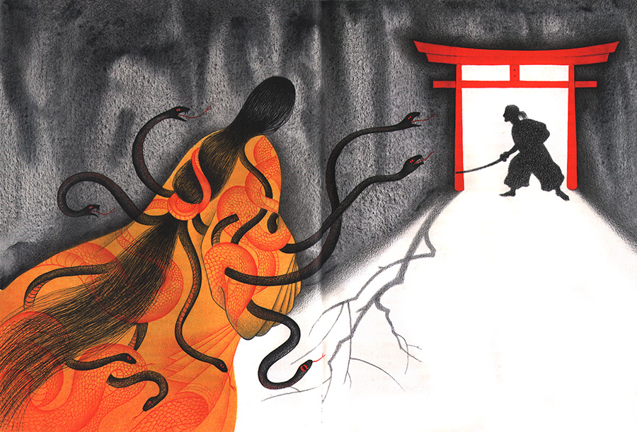Иллюстрации Яны Седовой словно погружают нас в мир древних японских художников, которые создавали свои работы акварелью и тушью: Такое впечатление складывается благодаря очень тонким линиям, расплывчатым кое-где контурам и использованию небольшого количества цветов (только жёлтый, красный и чёрный).
