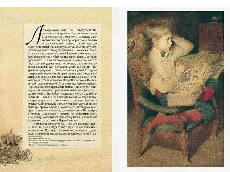 Я закончила читать книгу «Русская классика в иллюстрациях Геннадия Спирина», изданную «Редакцией Вилли Винки». Эта книга выглядит старинной, некоторые страницы желтые, как музейные рукописи, и в ней много незнакомых слов, значение которых можно узнать из сносок мелкими буквами внизу страниц. А ещё в книге много больших и интересных, но совершенно несовременных, на мой взгляд, иллюстраций, которые берут за душу. Вначале я даже подумала, что иллюстрации рисовал художник 19 века. А потом узнала, что это современный художник, и очень удивилась.