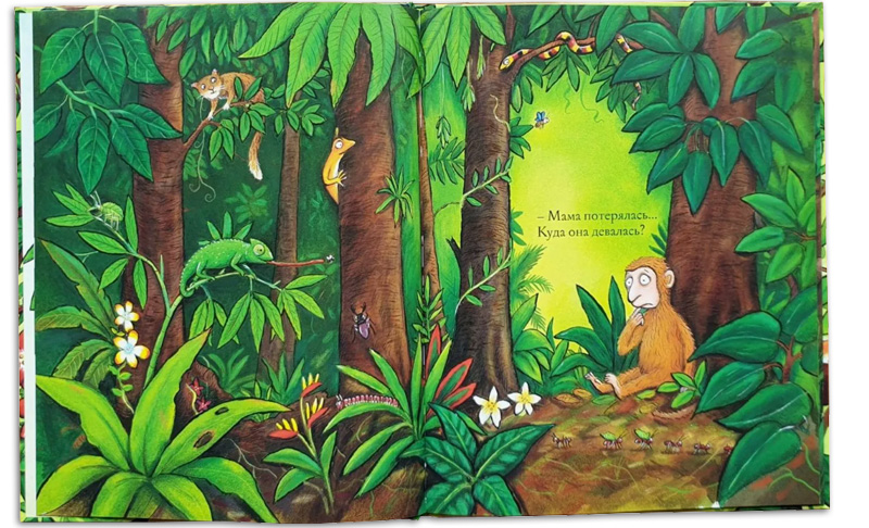 Большие глянцевые страницы с крупными иллюстрациями сразу притягивают глаза мальчишек: на каждом развороте много разных животных, все они изображены мультяшно, но узнаваемо – можно даже сказать, натуралистично. У потерявшейся мартышки – мордочка-личико, на котором очень наглядно отображаются эмоции: грусть, досада, обеспокоенность, радость и умиротворение. Мордочка-личико не только у мартышки, но и у ее собеседника мотылька, который берет на себя роль проводника и помогает обезьянке найти свою маму. Так книжка учит обращать внимание на выражение лиц: малыши слышат текст, интонацию взрослого и соотносят это с иллюстрацией. Легкие стишки держат детское внимание, даже попрыгунчик Федя не спешит слезть с дивана. Ползает, крутится, но взгляд от книги не отводит – получается, читает.