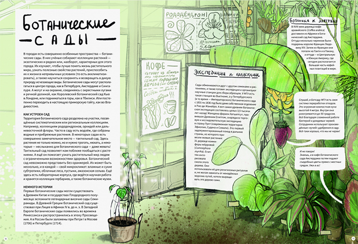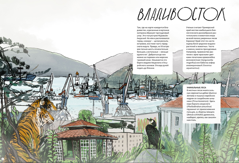 Владивосток. В этом дальневосточном приморском городе есть и звери, и птицы, и морские обитатели, и насекомые, и растения… Один из разворотов посвящён ботаническим садам и тому, как они устроены. Интересно прочесть и необычные истории про ботанические сады из разных стран.