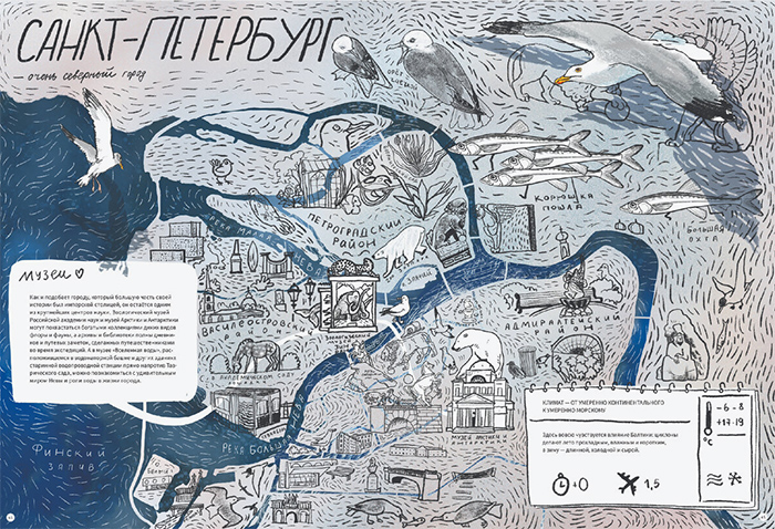 Мурманск. Красиво нарисован первый разворот: снег, ледокол, северное сияние, льды и полярная сова. Я узнала, что в Мурманске обитают морские жёлуди – это ракообразные, которые прикрепляются к стенкам камней у побережья. Считается, что они даже вкусны, но из-за твёрдой раковины достать из нее моллюсков довольно трудно.