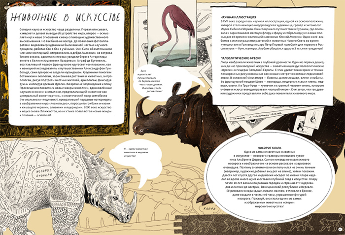 У некоторых городов есть дополнительный разворот, посвященный самым разным темам – например, рассказывается про бёрдвотчинг, наблюдение за птицами, и о том, как им этим не навредить, или про животных в искусстве. Оказывается, самое известное животное в искусстве – это носорог Клара, которую в Европе рисовали, отливали в бронзе и даже сделали в её честь часы. Мне было грустно читать разворот «Конфликты человека и дикой природы» – там рассказывается, какие опасности несёт для человека дикая природа, и о том, как люди вредят природе и животным.