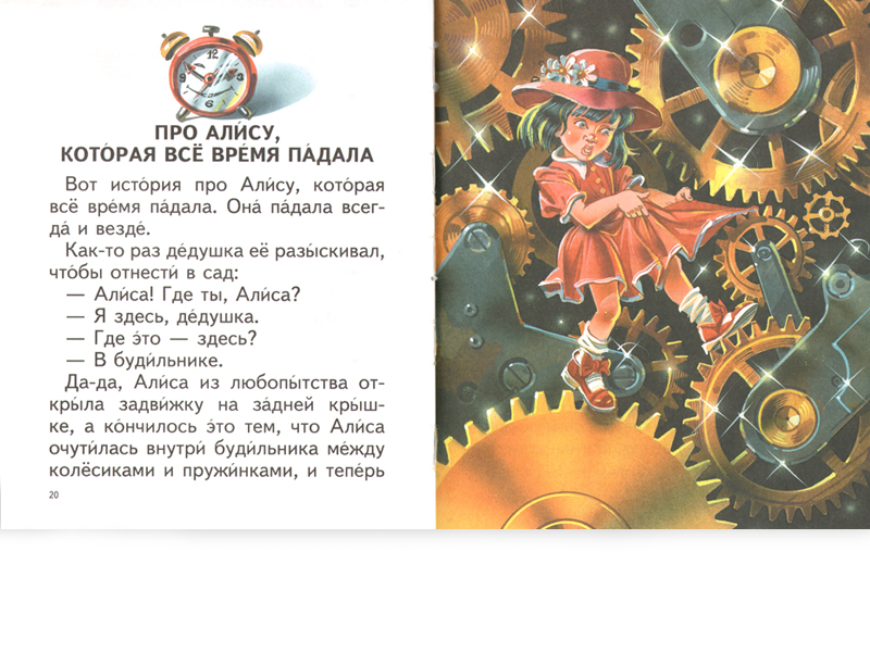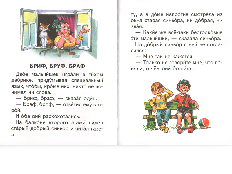 В идеале нужна интересная, увлекательная книга, написанная хорошим, в меру простым языком, и еще, чтобы в тексте были проставлены ударения, что немаловажно для ребенка, который учит русский. Разумеется, есть учебники по-русскому для детей. Но все же учебник в первую очередь ассоциируется с занятиями, с уроками. А хочется найти именно книгу, что называется, для «внеклассного чтения». Сборник Джанни Родари «Сказки по телефону» в переводе Натальи Лебедевой оказался оптимальным вариантом. Здесь есть и увлекательные смешные истории, и яркие красочные иллюстрации, и достаточно современный язык с богатой, но не слишком сложной лексикой. И самое главное для младшего школьника, изучающего русский язык, – это крупный шрифт и (ура!) ударения. К сожалению, в русском языке нет единого правила, которое могло бы объяснить, в каких словах куда падает ударение (ну разве что кроме буквы «Ё», которую кроме детской литературы почти нигде и не встретишь). Так вот, для ребенка, который учится читать и правильно говорить на русском, своем втором языке, ударения – очень непростая штука. Так что это издание, рассчитанное на детей «старшего дошкольного возраста», в принципе подходит и для детей до 10 лет, изучающих русский.