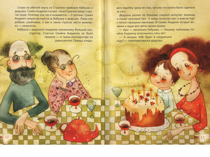 Альбом Семёна Андреича разделен на восемь частей: день рождения, детский сад, лыжная прогулка с мамой, папой и его новой женой, поздравления бабушки с 8 марта, знакомство с коровами и разноцветными цыплятами, обретение взрослого друга, который, возможно, станет его новым папой… И каждая глава непременно заканчивается улыбкой – если не самого пятилетнего мальчика Семёна, то уж точно улыбкой читателя. Вот Семёну исполняется пять лет, и он улыбается во всё свое щекастое лицо. Еще бы! Он получает в подарок велосипед и большой конструктор, из которого тут же строит огромный замок со рвами, мостами, пушками и катапультами.