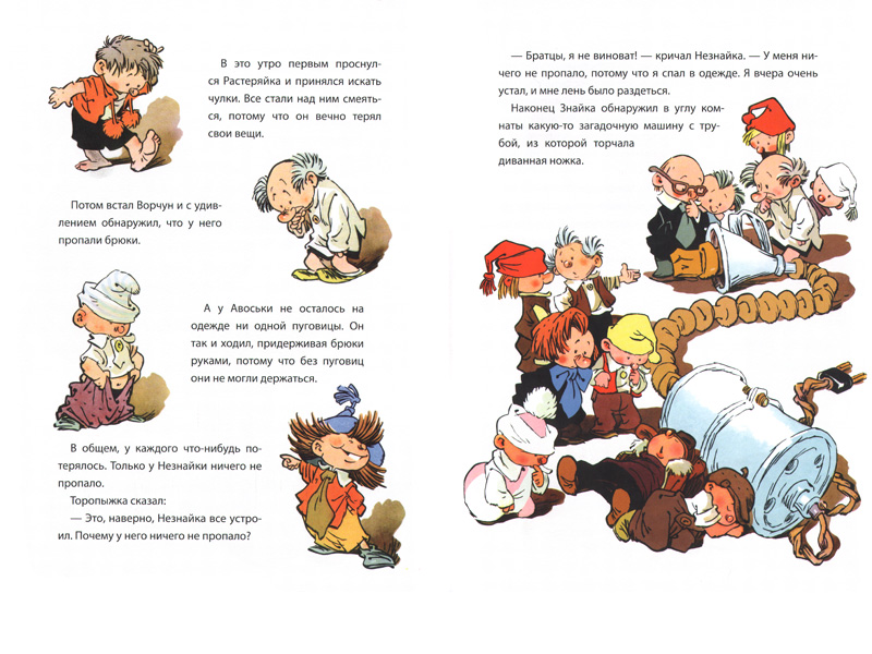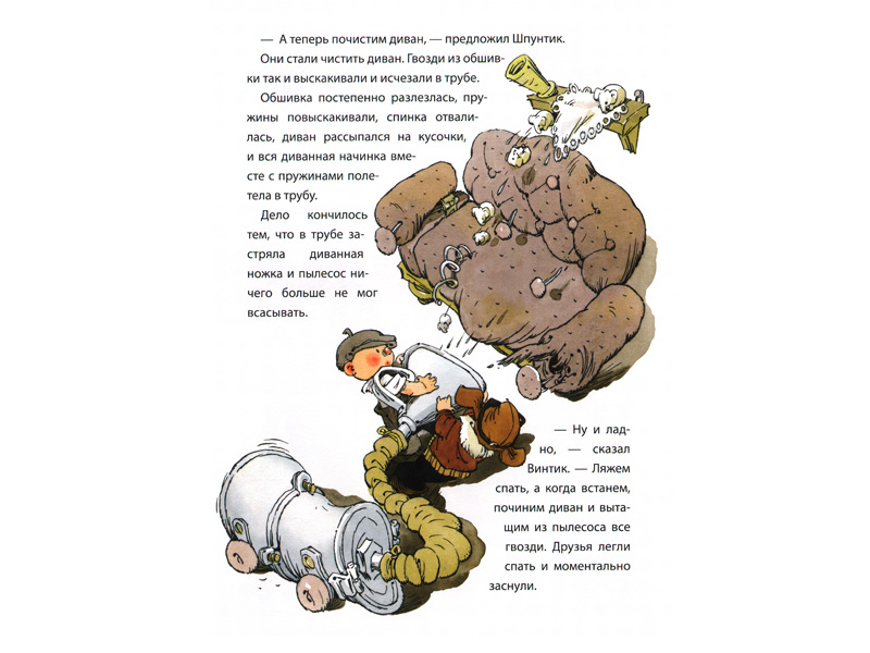 В книжке Винтик и Шпунтик поставили слишком мощный мотор, и пылесос начал втягивать внутрь даже сравнительно крупные вещи: конфеты Пончика, чулки Растеряйки, брюки Ворчуна, краски Тюбика. Федор очень развеселился и вместе с тем как будто испытал облегчение, когда в трубе застряла диванная ножка и пылесос не смог больше ничего поглощать.