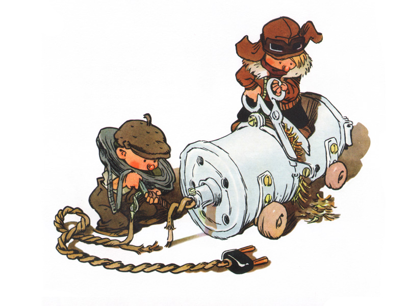 Федор просил меня снова и снова прочитать о том, как маленькие механики «сделали круглую металлическую коробку из двух половинок. В одной половинке поместили электромотор с вентилятором, к другой присоединили резиновую трубку, а между половинками проложили кусок плотной материи, чтобы пыль в пылесосе задерживалась».
