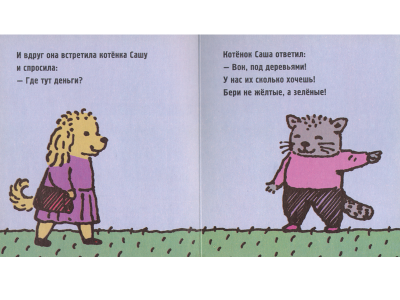 На следующей странице рисунок – собака Маруся разводит руками. Я еще и прочитать не успела, а сын мне уже объясняет: «Это потому, что у нее денег нет, и она не знает, где их взять. А брать их надо на дереве, и только зеленые, ну или трава вот тоже может быть деньгами…» И когда мы дошли до зеленого дерева, на котором буквально «растут деньги», Алик, окинув взглядом дерево и оценив трудную задачу сбора денег, говорит: «Вот если бы был динозавр, то он может так сделать, что дерево упадет, и тогда у них будет много денег!» Да, у нас помимо Петра еще есть небольшое увлечение динозаврами. Оригинальный метод решения проблемы – все деньги трудно достать, дерево большое, на помощь придут динозавры. Раз главные герои поросенок, собака и котенок, то динозавр, скажем, Василь Семеныч, вовсе не кажется таким уж невозможным вариантом.