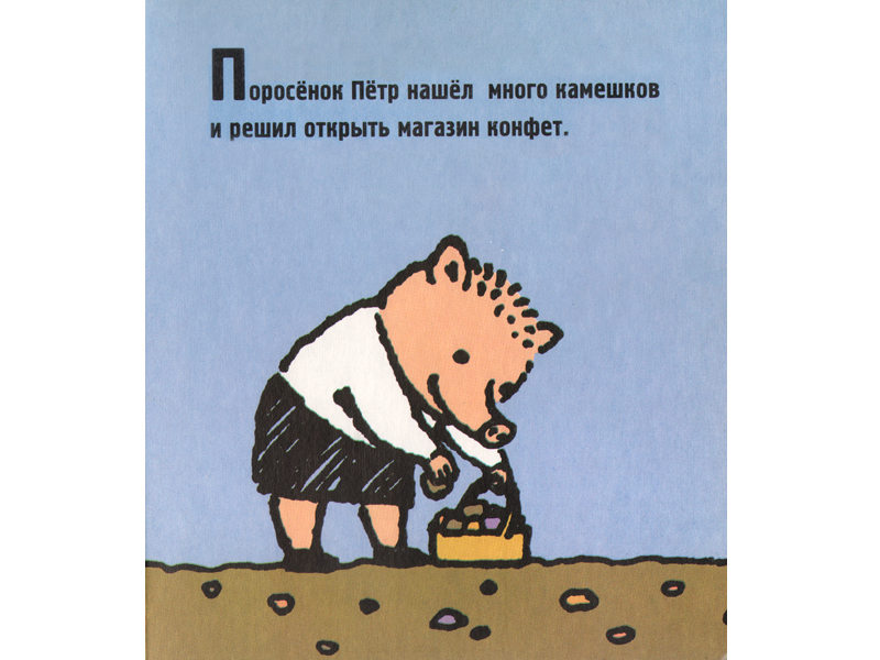 Петр открывает магазин и продает в нем конфеты из камешков, которые он нашел на улице. Сын сразу себя узнает, это вполне знакомая нам история: таким же образом он на днях насыпал земли в пакетик и сказал, что это «закуска». А до этого разрезал лист бумаги на множество маленьких кусочков, объяснив, что это приглашения на день рождения. Эти сказки Петрушевской тем и хороши, что ребенок прекрасно понимает, что чувствует и думает поросенок Петр. Поросенок Петр очень похож на маленького мальчика, живущего где-то по-соседству. С ним можно соорудить машину из стула и крышки от кастрюли (которую, кстати сказать, мама дает поросенку Петру со словами: «Только не потеряй!» – тоже многим знакомая ситуация). Получается, послушать историю про поросенка Петра – это поиграть с приятелем и потом непременно сесть «пить чай с конфетами» (этими словами заканчиваются все три истории Петрушевской). И язык Петрушевской, отображающий мышление и речь ребенка, и иллюстрации, словно нарисованные ребенком, поддерживают впечатление разговора двух четырехлетних приятелей о делах насущных: где взять деньги на конфеты или на чем поехать в гости к знакомой.