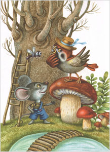 Первый – повесть Валерия Медведева «Голоса». История очень проста: Воробьенку не нравилось его писклявое чириканье, и он уговорил своих друзей поменяться голосами. Сам Воробьенок взял себе голос Собачонка (не знаю, почему автор не использует слово «щенок»), Комаренок поменялся с Медвежонком, а Мышонок с Котенком. И потом все они отправились по домам, где, естественно, родители не узнали своих деток. Всем худо пришлось: Котенка приняли за мышь и чуть не съели, от медвежьего рыка Комаренка родители-комары упали в обморок и «до сих пор в себя не пришли», Медвежонка прихлопнули, как комара…