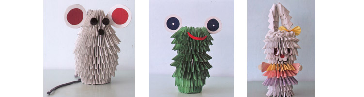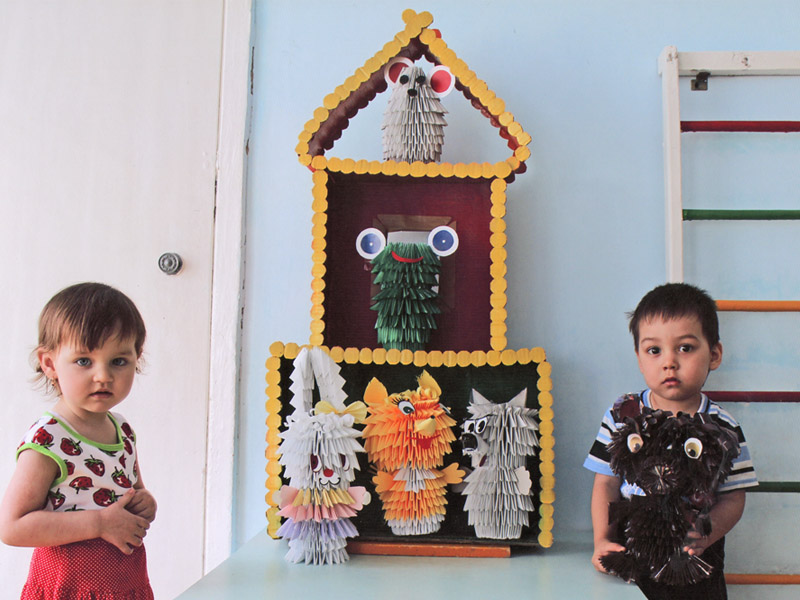 Мышка, заяц, лягушка, лиса и волк изготовлены из офисной бумаги. Цветная офисная бумага окрашена с двух сторон и не белеет на сгибах.